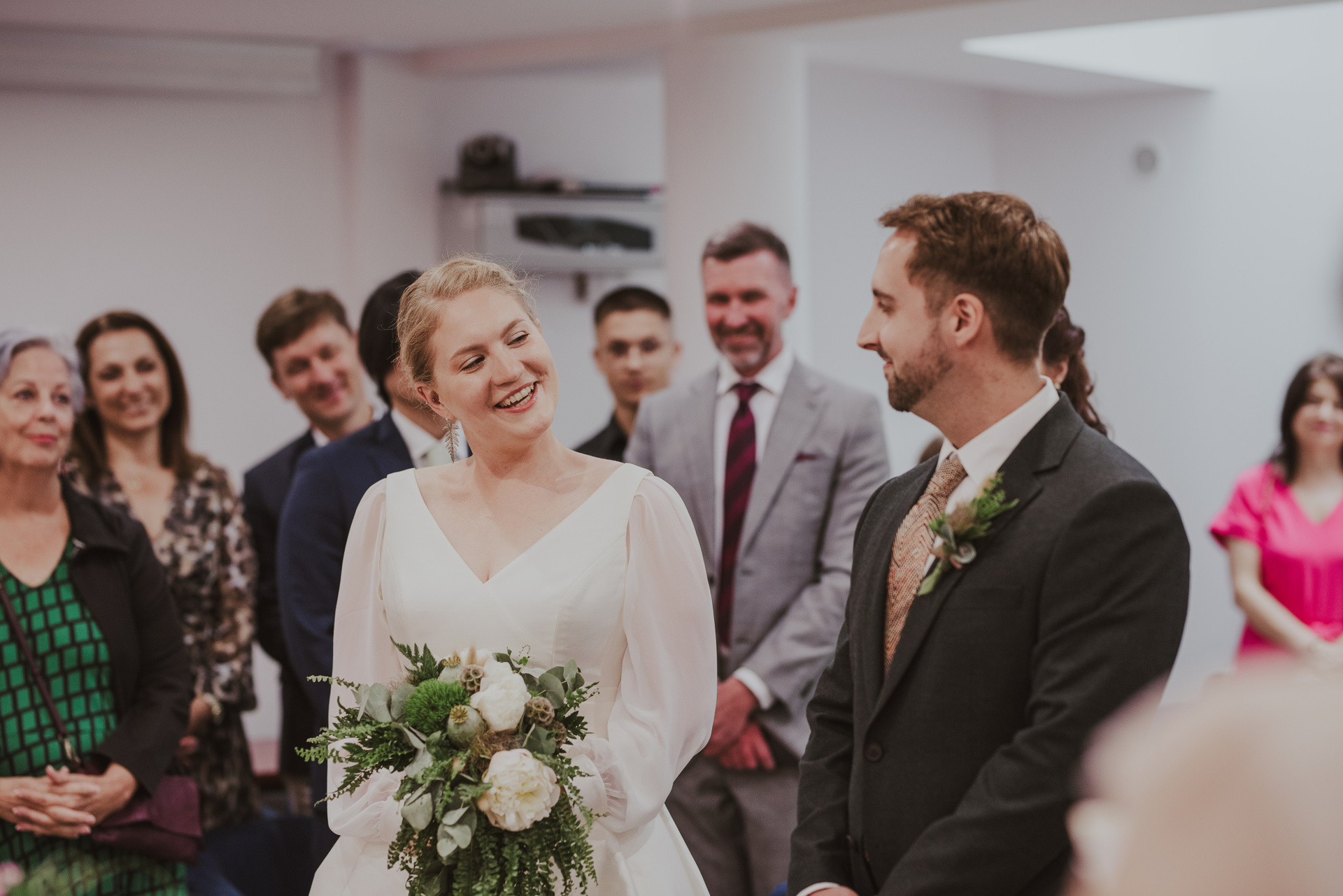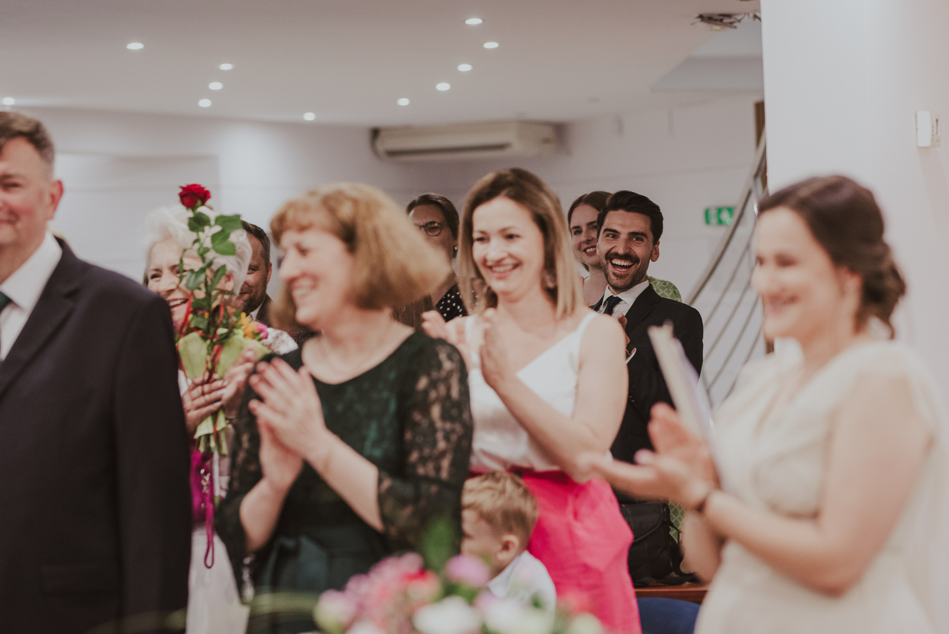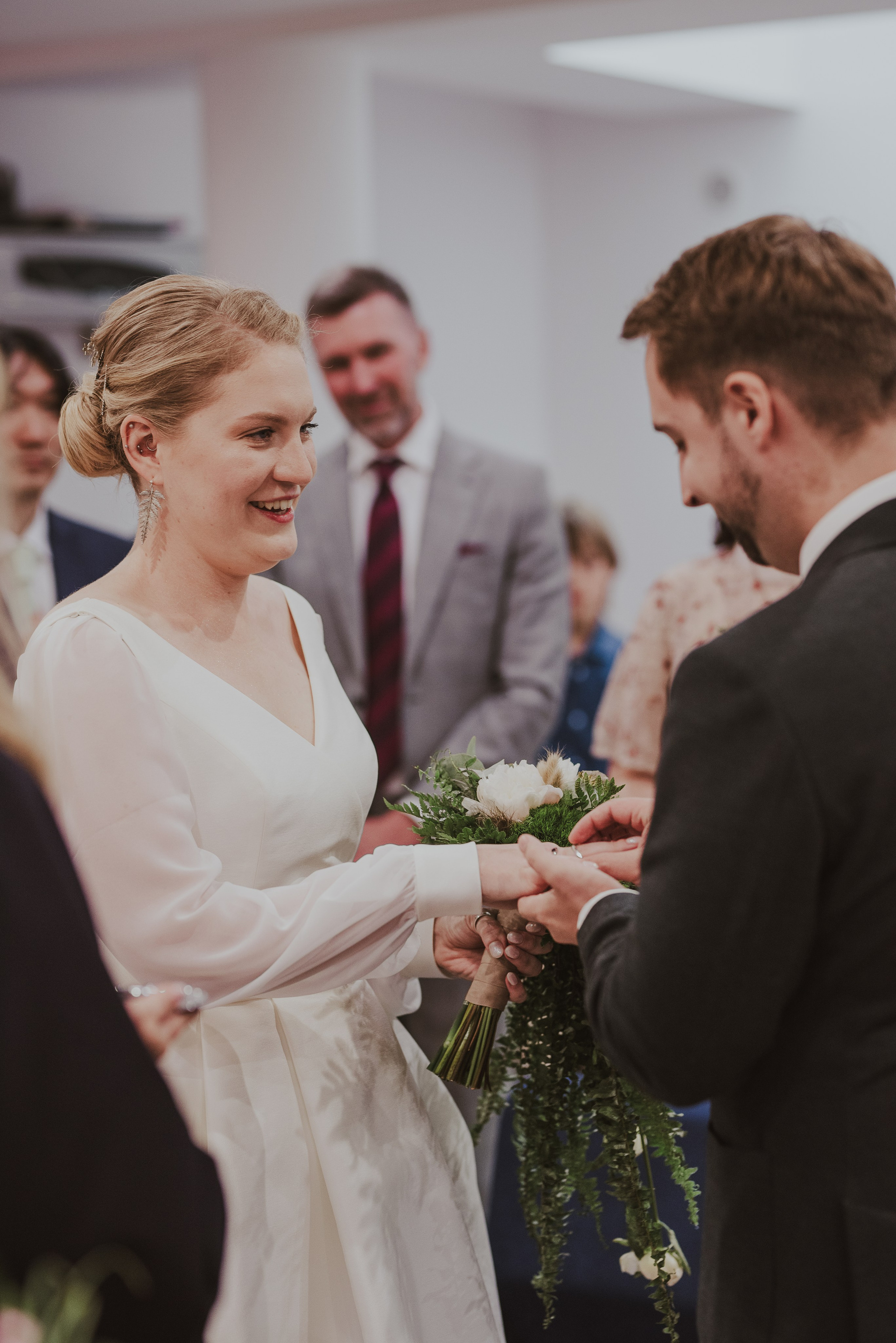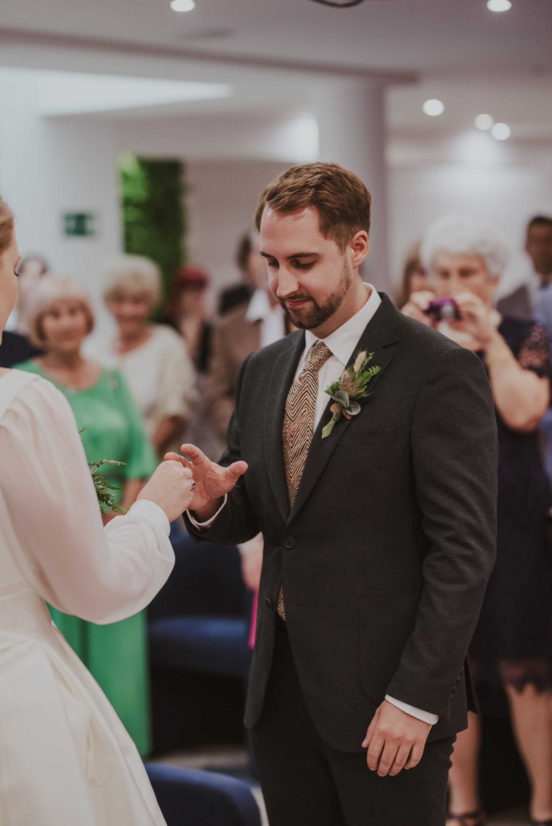 To była krótka uroczystość, 2023 rok opiewał głównie w takie :) Młodych poznałam tuż przed urzędem, Suknia Zuzy była zachwycająca i uwaga! Miała kieszenie :) Tom również przystojnie się prezentował, zakochałam się w kolorze jego garnituru - jednak kwiaty w butonierce powodowały u niego alergię, chociaż ja wolałam myśleć, że jest taki wzruszony :) Wejściu młodym do urzędu towarzyszyła ciekawska sójka, która czekała i obserwowała nas na ławce. Sama urzędniczka przeprowadziła uroczystość w piękny i zabawny sposób, napisała nawet wiersz z okazji śluby tych dwojga:)