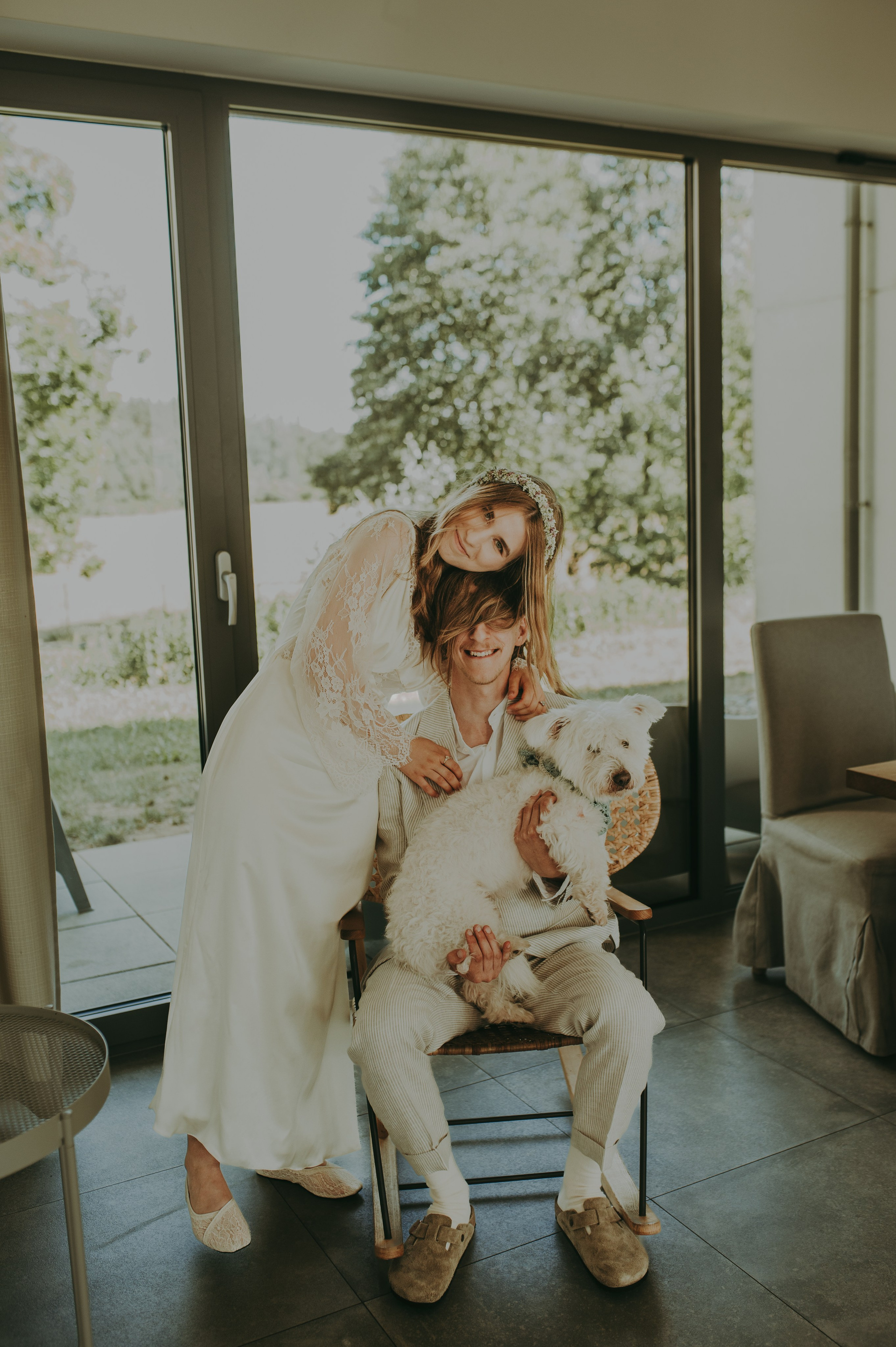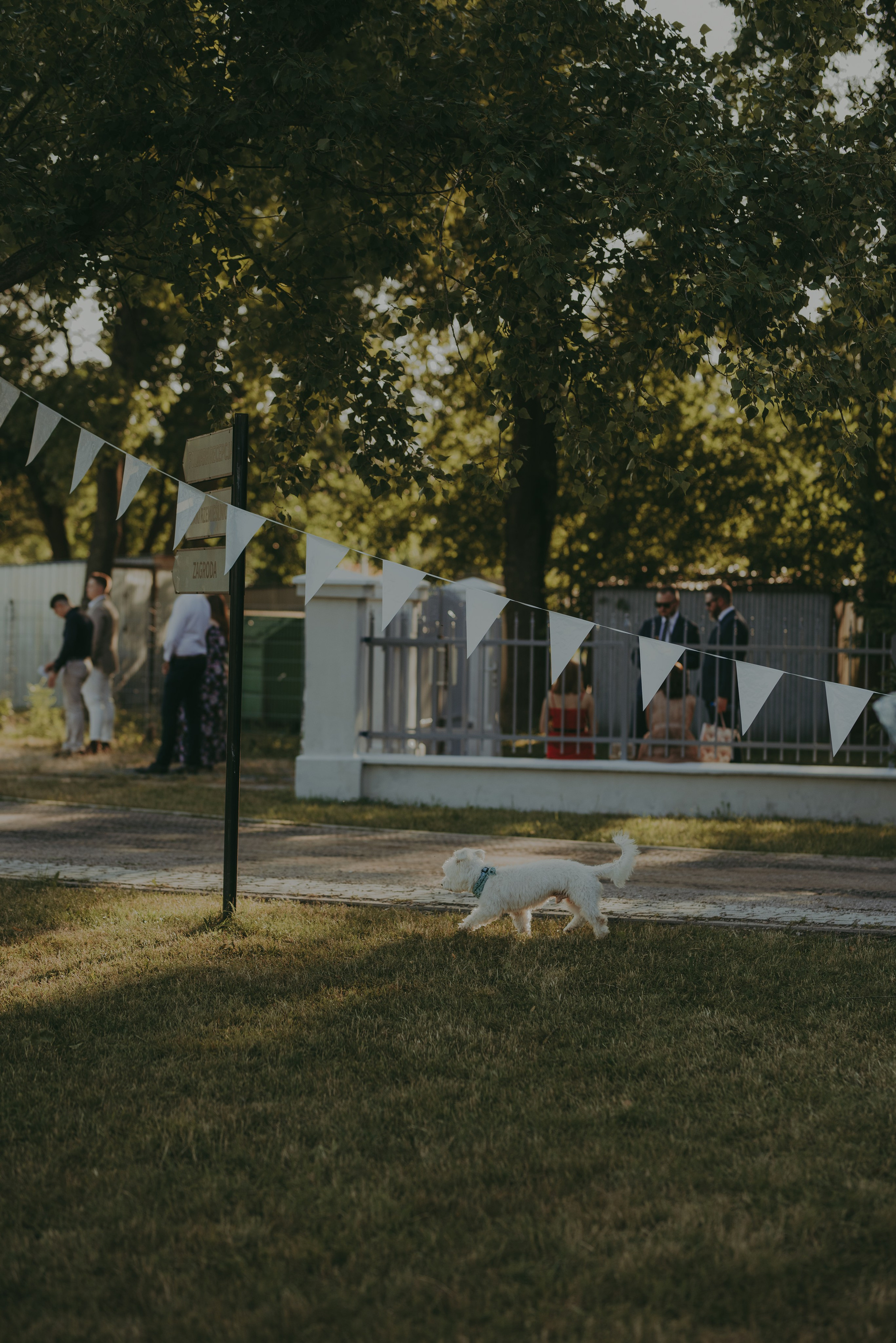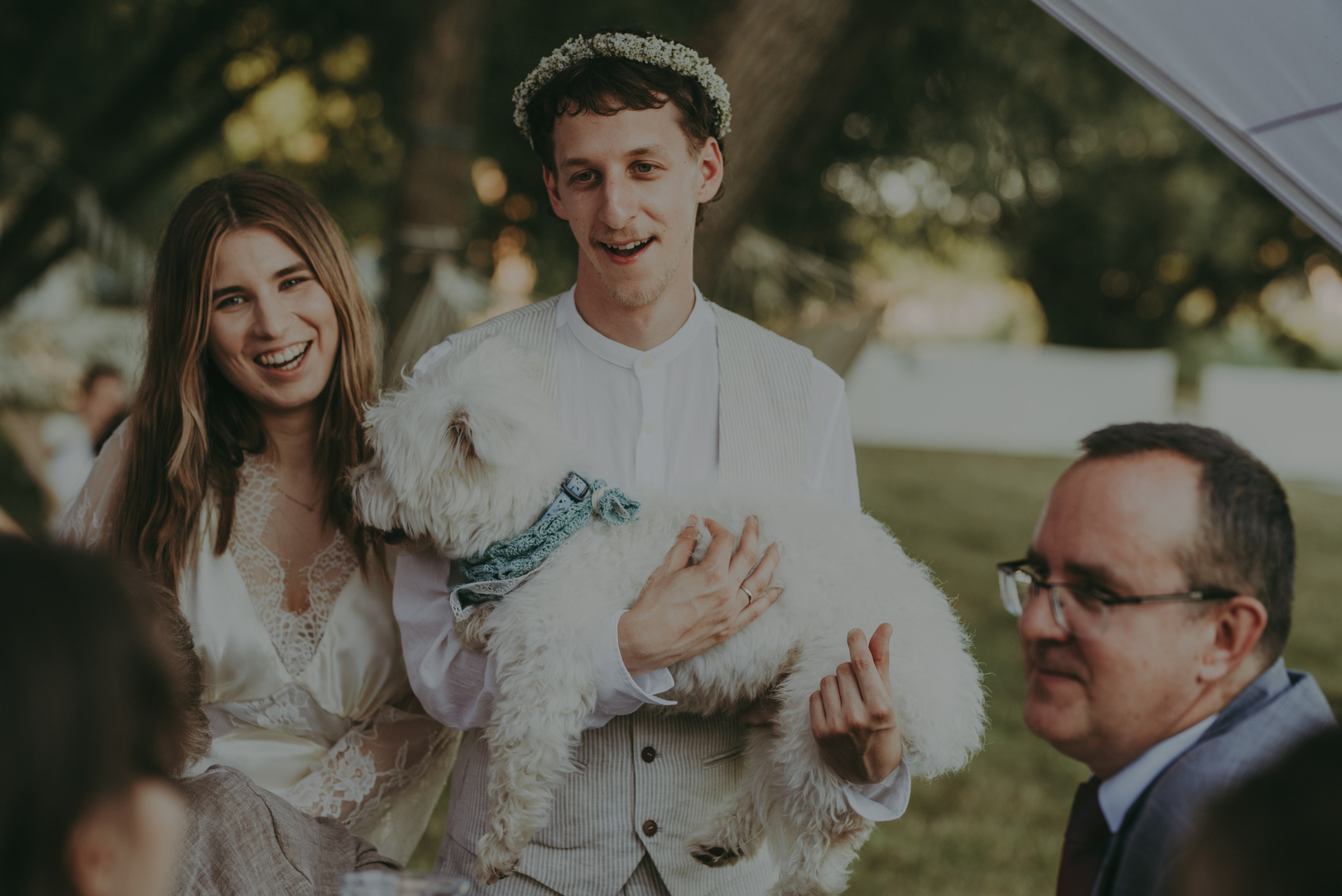 Ceremonia ślubna i przyjęcie odbywały się w spokojnej, rodzinnej atmosferze, w otoczeniu zieleni i pięknych wnętrz folwarku. Dzięki temu nawet piesek Państwa Młodych mógł uczestniczyć w ich wielkim dniu – od porannych przygotowań aż po późne godziny wesela. To był prawdziwie kameralny ślub z psem w roli wyjątkowego gościa!